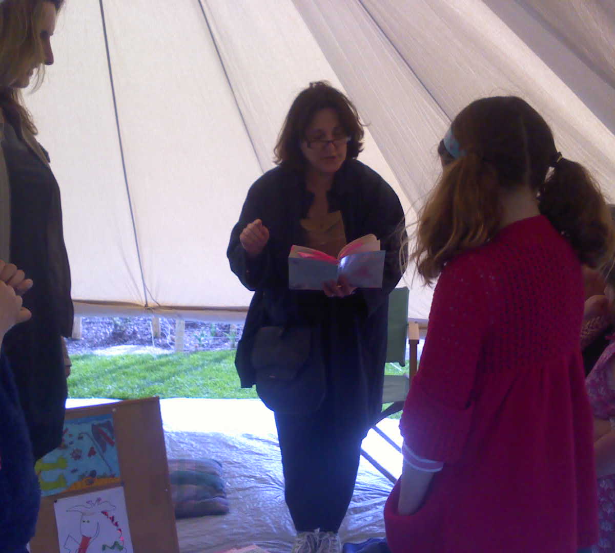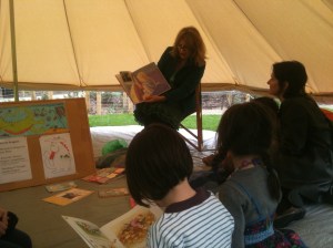 Our group turned out to celebrate the opening of a lovely re-worked piece of greenspace, Arundel Square in Islington on Sunday (Marion Rose, Lynda Waterhouse , Paul Willcocks, and me). The actor, Rupert Graves, and his family were kind enough to lend us a bell tent (I want one now!) to read our stories in, and children drifted in and out. I took a few photos of Marion and Lynda reading (well, actually, my daughter took the best ones), and enjoyed watching the many children listening to my friends read out a few stirring tales.