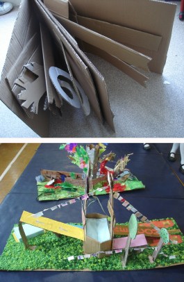 I was running a two-day session at St Agnes RC Primary in Cricklewood and decided to give the year 3 and 4 pupils a special task. Handing them two giant, collapsible frameworks made from cardboard, I gave them a very brief set of instructions before sending them away to start work.